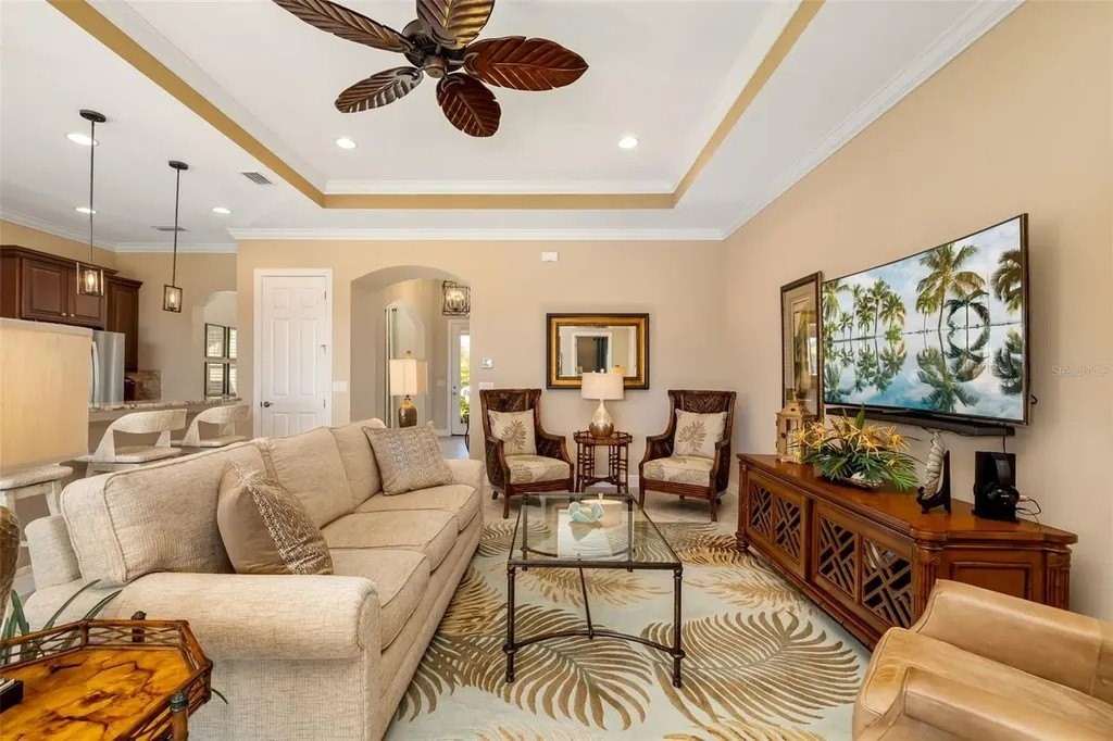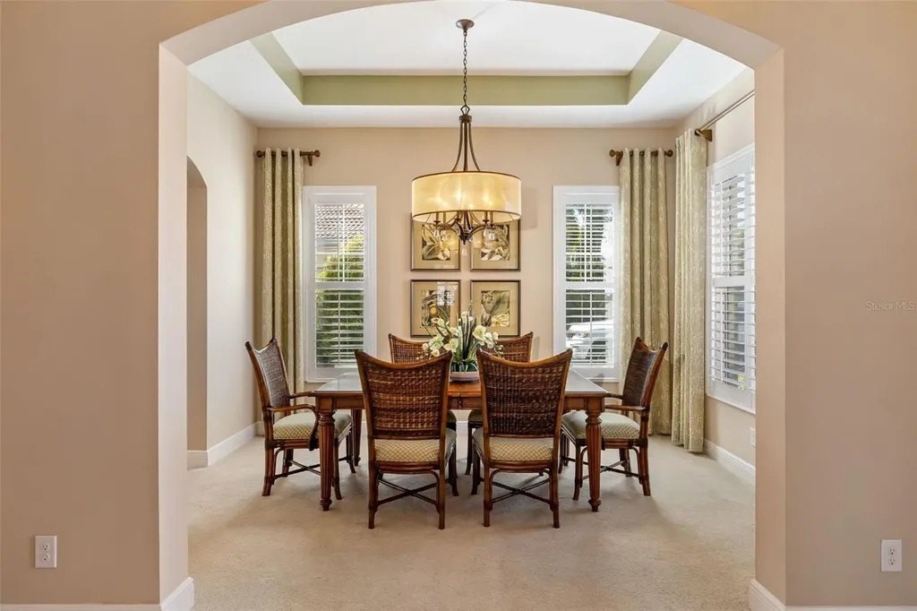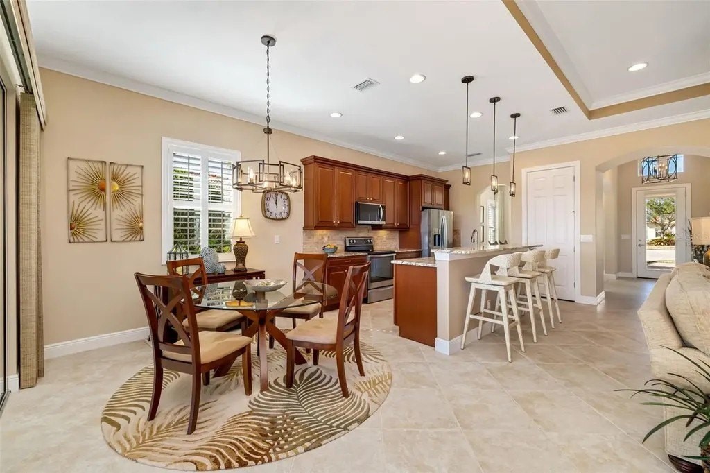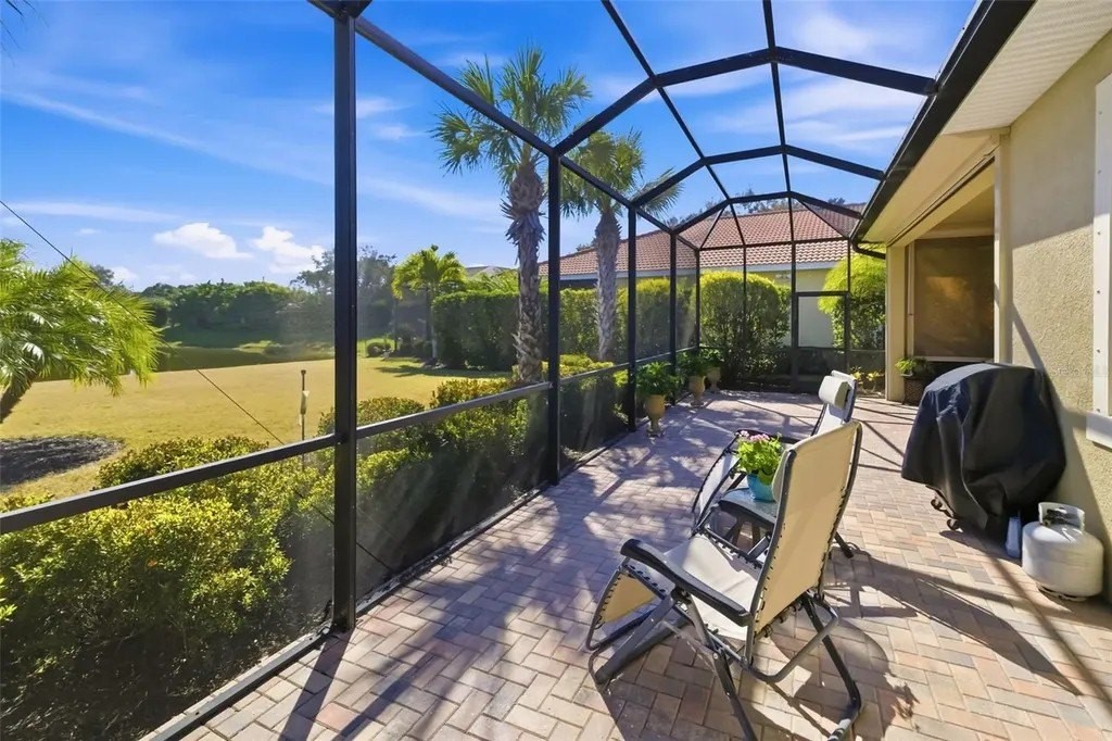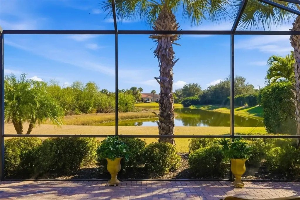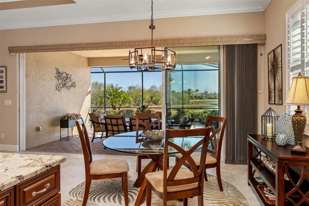 Long lake views framed by a lush nature preserve set the stage for a home where serenity and natural beauty greet you every day in the prestigious Venetian Golf & River Club. Ideally positioned on a quiet cul-de-sac, this meticulously maintained residence is designed for effortless living and timeless elegance. Tall ceilings, tray details, crown molding, plantation shutters, and neutral ceramic tile laid on the diagonal create a light-filled interior. The spacious living room features an 11-foot tray ceiling and a full wall of sliding glass doors that seamlessly blend indoor and outdoor living. The true highlight is the extended stone paver lanai with bronze screen enclosure and Storm Smart protection. Expansive lake and preserve views create a breathtaking backdrop; perfect for morning coffee, evening sunsets, and quiet moments surrounded by birds and wildlife. A chef-inspired kitchen showcases warm solid wood cabinetry with crown molding, granite countertops, subway tile backsplash, under-cabinet lighting, stainless steel appliances, and a breakfast bar. A sunny breakfast nook overlooks the lanai, while the formal dining room offers an inviting space for entertaining. The primary suite provides a peaceful retreat with tray ceiling, custom walk-in closet, and a spa-like bath featuring split vanities, soaking tub, walk-in shower with built-in bench, and private water closet. The split-bedroom layout ensures privacy, with two additional bedrooms complemented by a well-appointed second bathroom. A spacious laundry room with cabinetry and utility sink, a two-car garage with built-in storage, and a recently replaced HVAC system (November 2025) add everyday convenience. Beyond the home, life at Venetian Golf & River Club feels like a resort vacation every day. This gated community offers 24-hour security, two pools, the full-service River Club with dining and tiki bar, tennis and pickleball courts, fitness center, and a vibrant social calendar. Optional membership is available for the 18-hole Chip Powell championship golf course. All of this is set along a 70-acre nature preserve backing to the Myakka River, just minutes from shopping, dining, healthcare, historic downtown Venice, and pristine Gulf beaches.