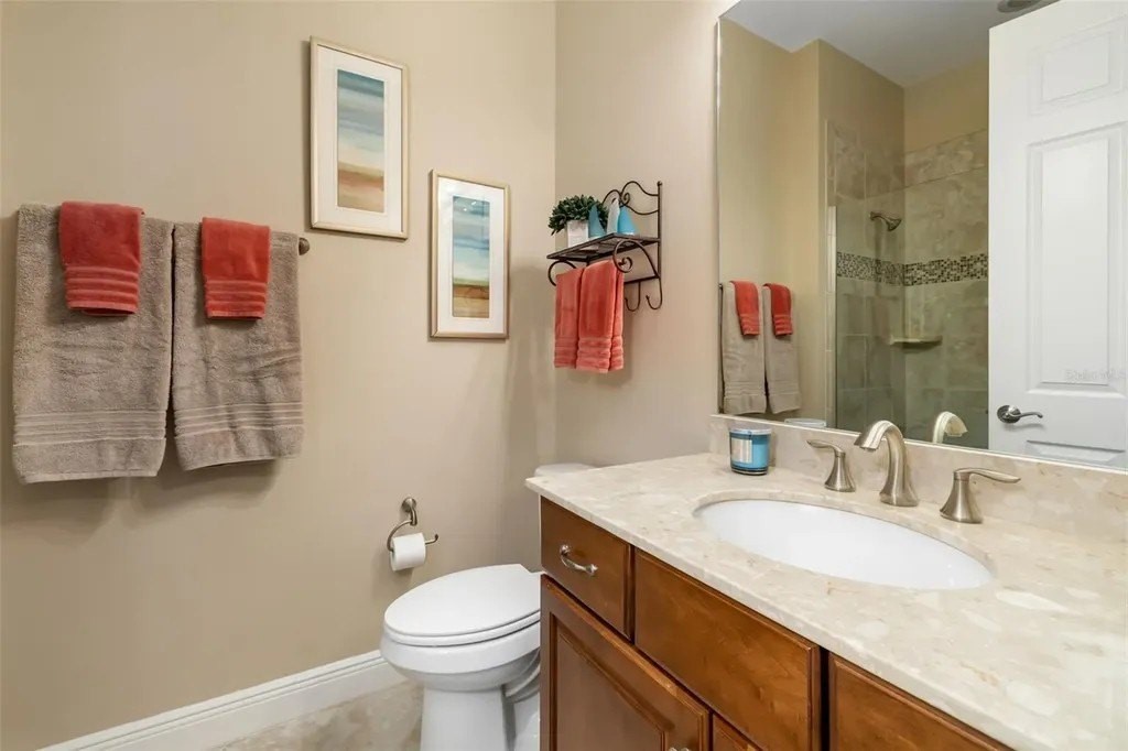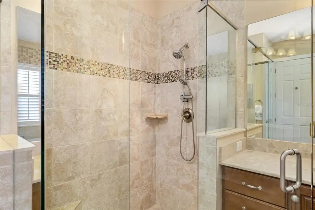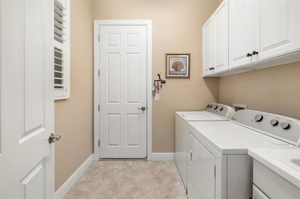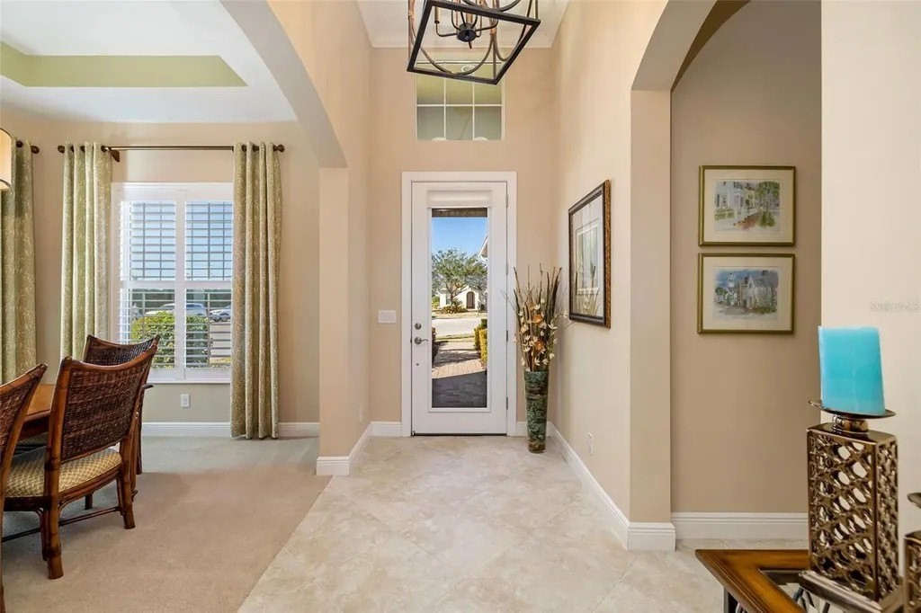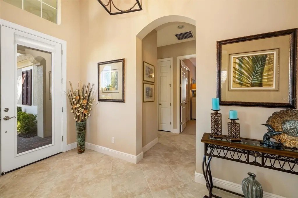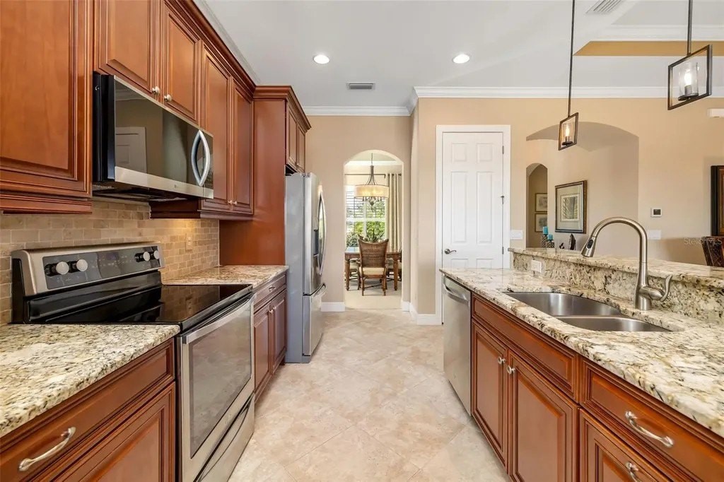 Long lake views framed by a lush nature preserve set the stage for a home where serenity and natural beauty greet you every day in the prestigious Venetian Golf & River Club. Ideally positioned on a quiet cul-de-sac, this meticulously maintained residence is designed for effortless living and timeless elegance. Tall ceilings, tray details, crown molding, plantation shutters, and neutral ceramic tile laid on the diagonal create a light-filled interior. The spacious living room features an 11-foot tray ceiling and a full wall of sliding glass doors that seamlessly blend indoor and outdoor living. The true highlight is the extended stone paver lanai with bronze screen enclosure and Storm Smart protection. Expansive lake and preserve views create a breathtaking backdrop; perfect for morning coffee, evening sunsets, and quiet moments surrounded by birds and wildlife. A chef-inspired kitchen showcases warm solid wood cabinetry with crown molding, granite countertops, subway tile backsplash, under-cabinet lighting, stainless steel appliances, and a breakfast bar. A sunny breakfast nook overlooks the lanai, while the formal dining room offers an inviting space for entertaining. The primary suite provides a peaceful retreat with tray ceiling, custom walk-in closet, and a spa-like bath featuring split vanities, soaking tub, walk-in shower with built-in bench, and private water closet. The split-bedroom layout ensures privacy, with two additional bedrooms complemented by a well-appointed second bathroom. A spacious laundry room with cabinetry and utility sink, a two-car garage with built-in storage, and a recently replaced HVAC system (November 2025) add everyday convenience. Beyond the home, life at Venetian Golf & River Club feels like a resort vacation every day. This gated community offers 24-hour security, two pools, the full-service River Club with dining and tiki bar, tennis and pickleball courts, fitness center, and a vibrant social calendar. Optional membership is available for the 18-hole Chip Powell championship golf course. All of this is set along a 70-acre nature preserve backing to the Myakka River, just minutes from shopping, dining, healthcare, historic downtown Venice, and pristine Gulf beaches.